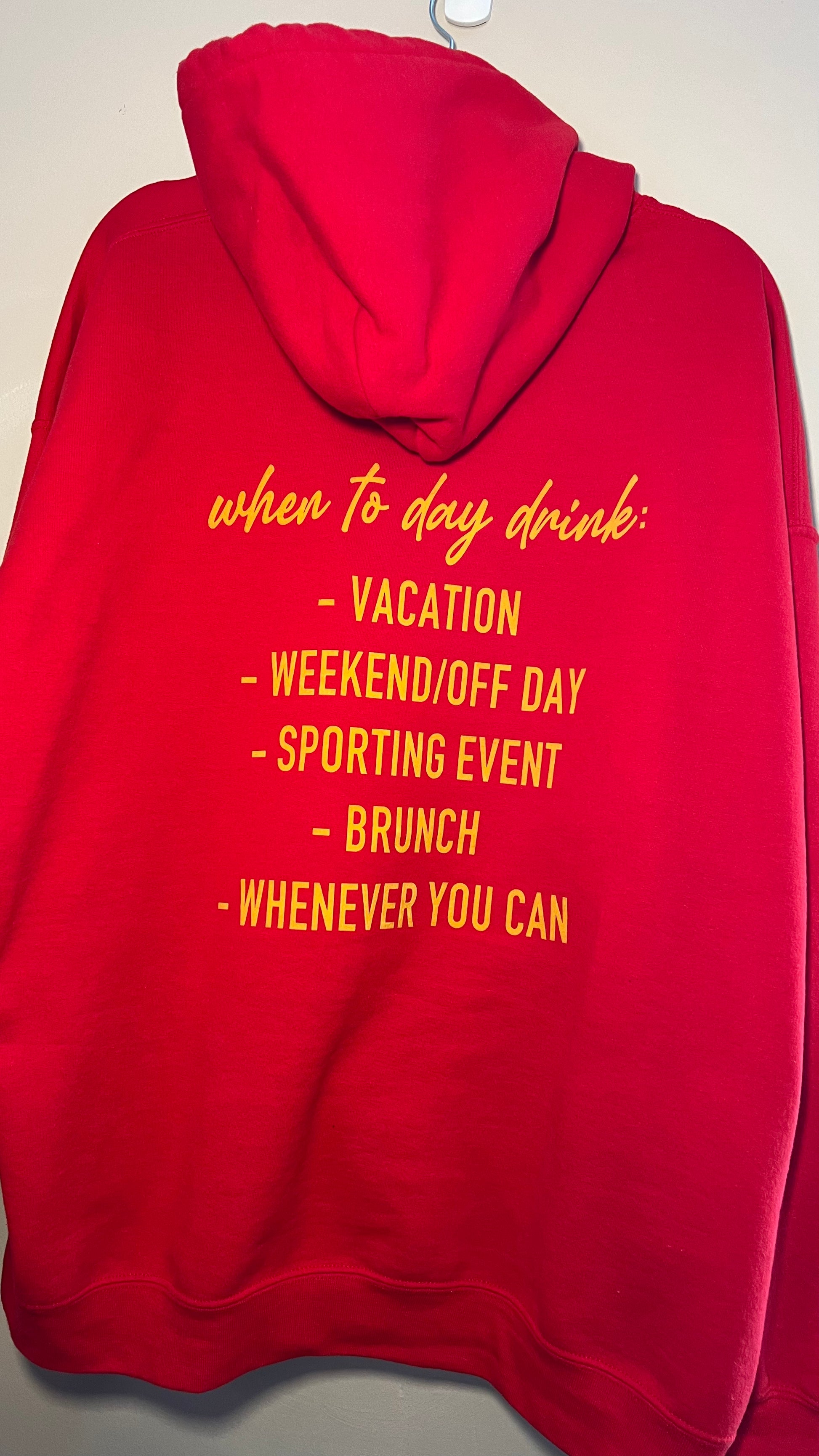 Red hoodie with yellow flocked (raised texture) vinyl. For an oversized look make sure to size up.